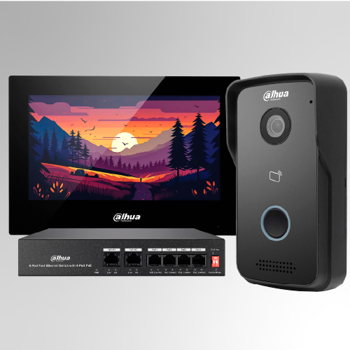DHI-KTP03 – KIT VIDEO PORTERO HOGAR IP – VTO2111D-P-S2 – VTH2621G-P – PFS3005-4ET-36E – PRESENTACION EN CAJA